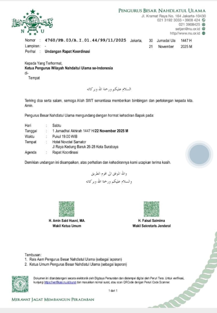 Dalam surat tertanggal 21 November 2025, rapat koordinasi itu bakal dilangsungkan di Hotel Novotel Samator, Surabaya, Jawa Timur pada Sabtu malam, 22 November 2025. Surat itu diteken oleh Wakil Ketua Umum PBNU Amin Said Husni dan Wakil Sekretaris Jenderal PBNU Faisal Saimima.